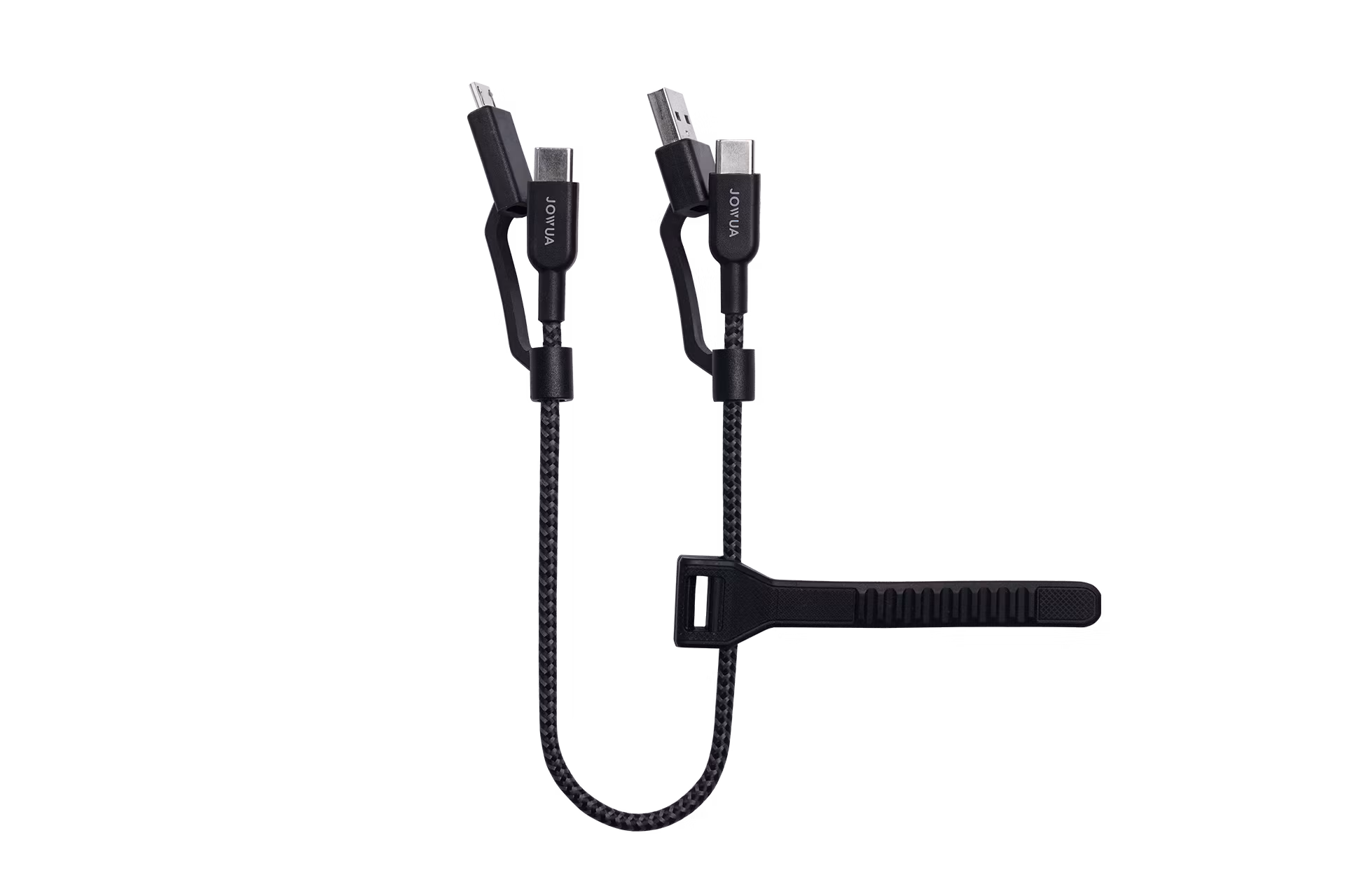 30 cm short wire design, easy for carrying and storage without cable tangling. Supports up to 60W USB-C PD and 480 Mbps transfer speeds. Integrated USB-A and Micro USB adapters support up to 4 configurations.